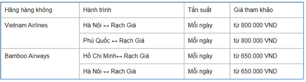 - Đây là giá vé máy bay đi Rạch Giá một chiều, hạng phổ thông, chưa bao gồm thuế phí;